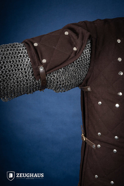 A Brigantina Castanha é uma peça de armadura imponente, concebida para o guerreiro destemido. Fabricada com detalhes em tachas, esta brigantina foi criada para ser usada sobre cota de malha, oferecendo uma camada adicional de proteção no campo de batalha. Ligada por resistentes tiras de couro com fivelas de latão nas laterais, garante um ajuste seguro e personalizável para guerreiros de todos os tamanhos. Com uma gola alta em torno do pescoço, proporciona defesa reforçada sem comprometer o conforto durante o combate. As aberturas à frente e nas laterais permitem maior mobilidade, assegurando liberdade e agilidade mesmo nos momentos mais intensos da batalha.