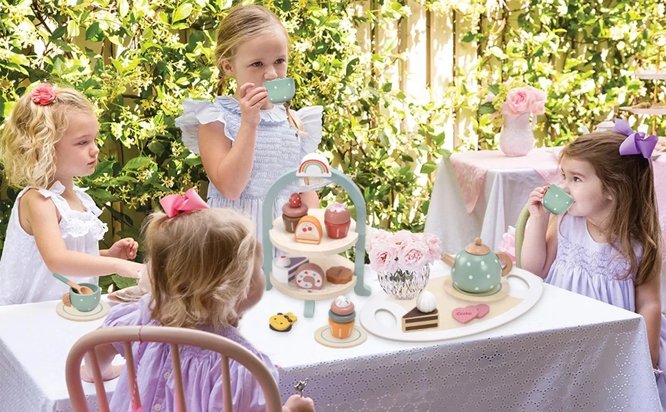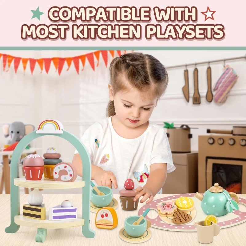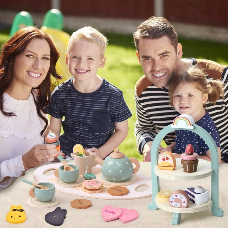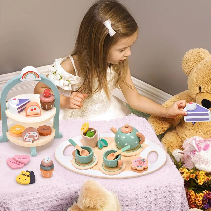 Brinquedos de Madeira para Meninas – Conjunto de Chá da Tarde, Cozinha Infantil, Jogo de Faz‑de‑Conta com Torradeira, Cafeteira, Gelado – Brinquedo Educativo para Crianças